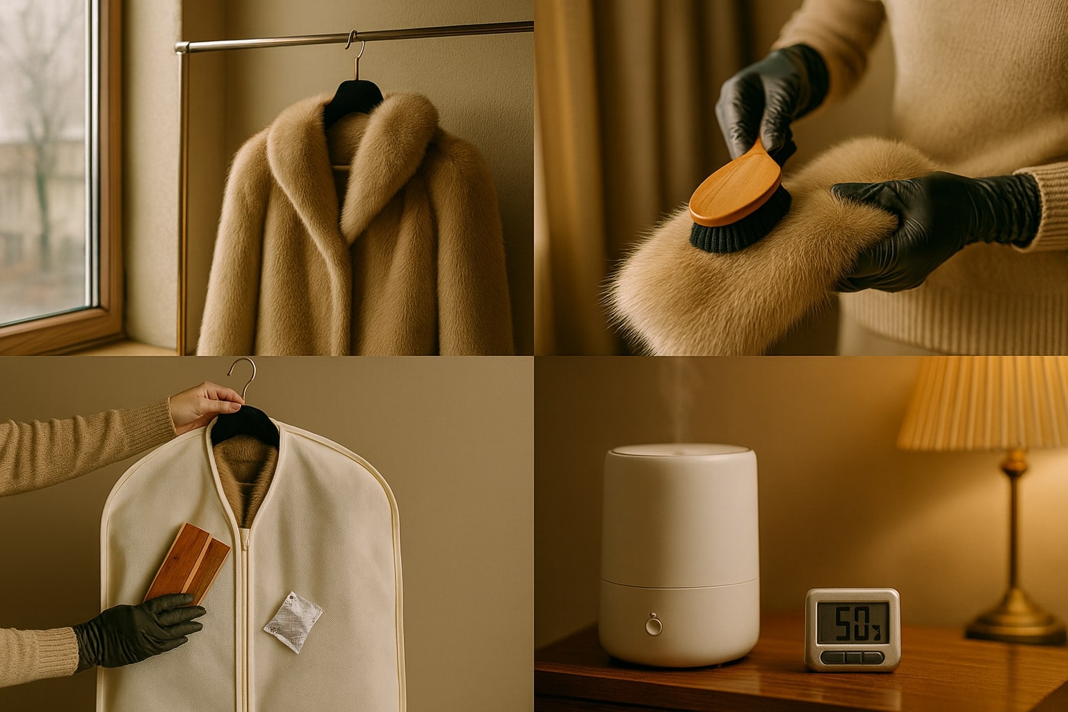 Ține la îndemână un umeraș lat din lemn, o perie cu peri moi, o husă textilă respirabilă, un pulverizator cu apă distilată, mănuși curate din bumbac și sticky notes pentru „verificări viitoare”. Minimal, dar eficient.